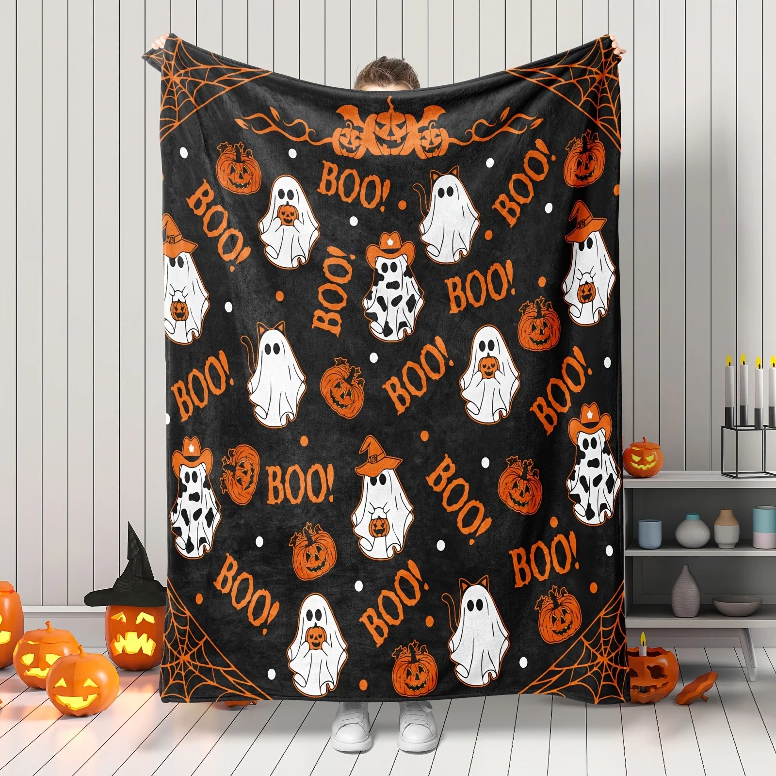 Cozy Flannel Halloween Throw Blanket - Spooky Ghosts & Pumpkins Design, Soft & Warm for Couch, Bed, Camping