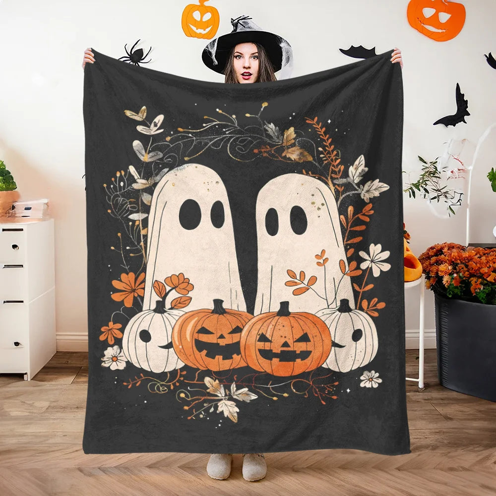 Halloween & Pumpkin Throw Blanket – Cute Cartoon Ghosts, Jack-o'-Lanterns, and Autumn Leaves