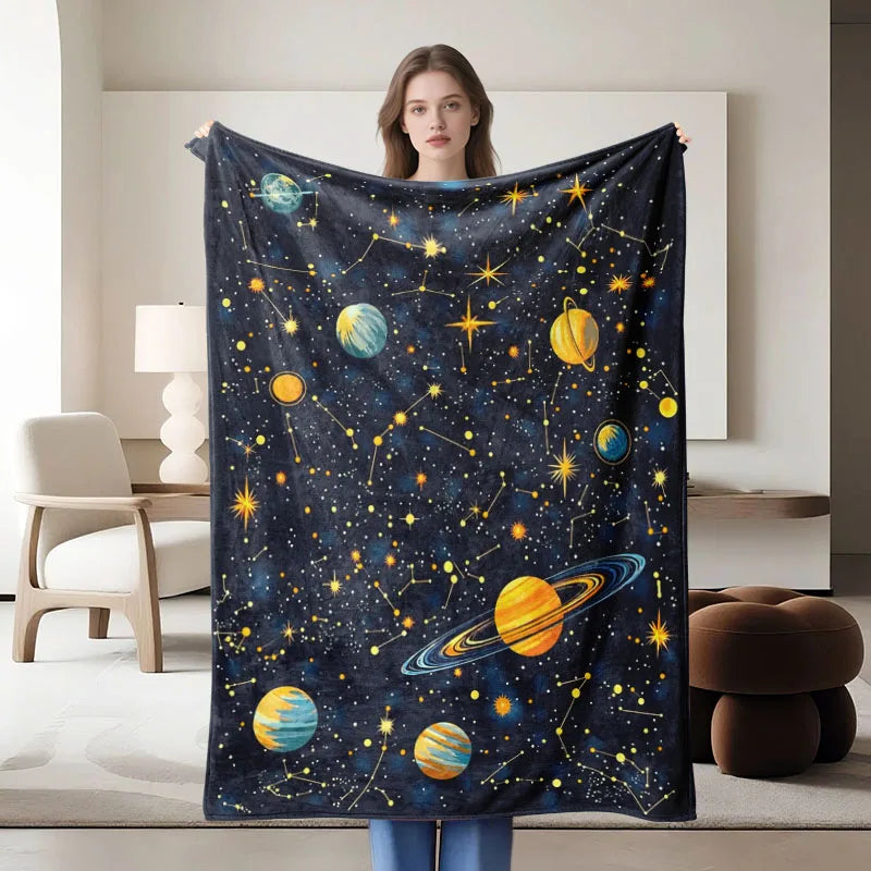 Space-themed navy blue flannel blanket, soft, all-season use.